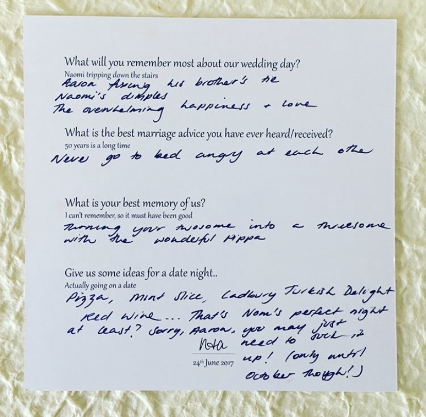 Your guests will enjoy filling it out also as the prompts are helpful and fun entertainment to fill out during dinner.